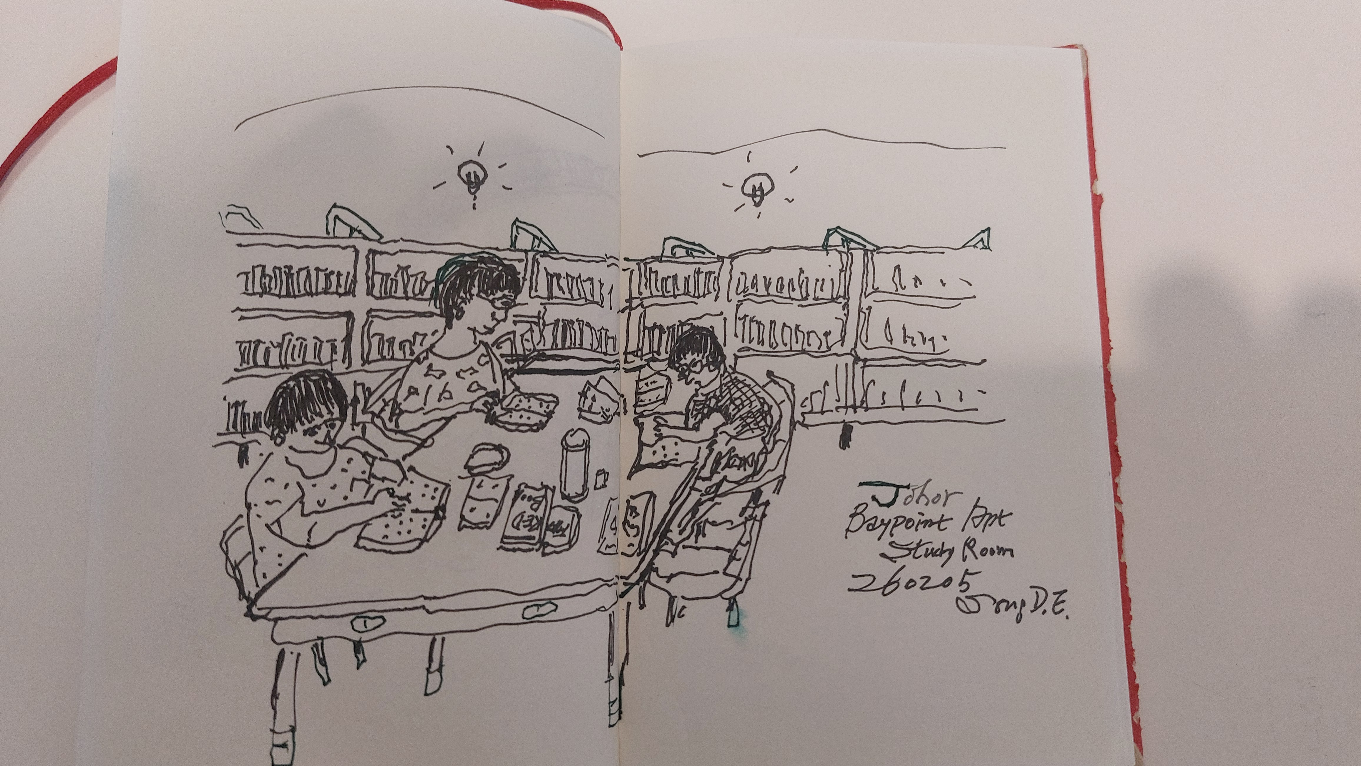 이번 여행에서 어반스케치를 자주 해야겠다고 생각했다.뜻대로 되지 않았다.가끔 스케치하는 내그림을 흘깃거리더니 손주들도 저희들 스케치북을 꺼내들고 그림 그리는 흉내를 낸다.오늘 아침 잠에서 깨어나 아이들 스케치북을 살펴봤다.놀랍다.한 넘이 그린 집콕스케치가 소실점이며 원근 표현이 나 보다 낫다.이번 한 달 동안 여행에서 얻은 수확이 수영실력이 늘은 것과 이 그림 그리기의 결과물이 아닐까.손주들이 이번 여행에서 경험과 관찰의 영역이 한 단계 넓어졌다면 이 보다 더 큰 수확이 있을까.