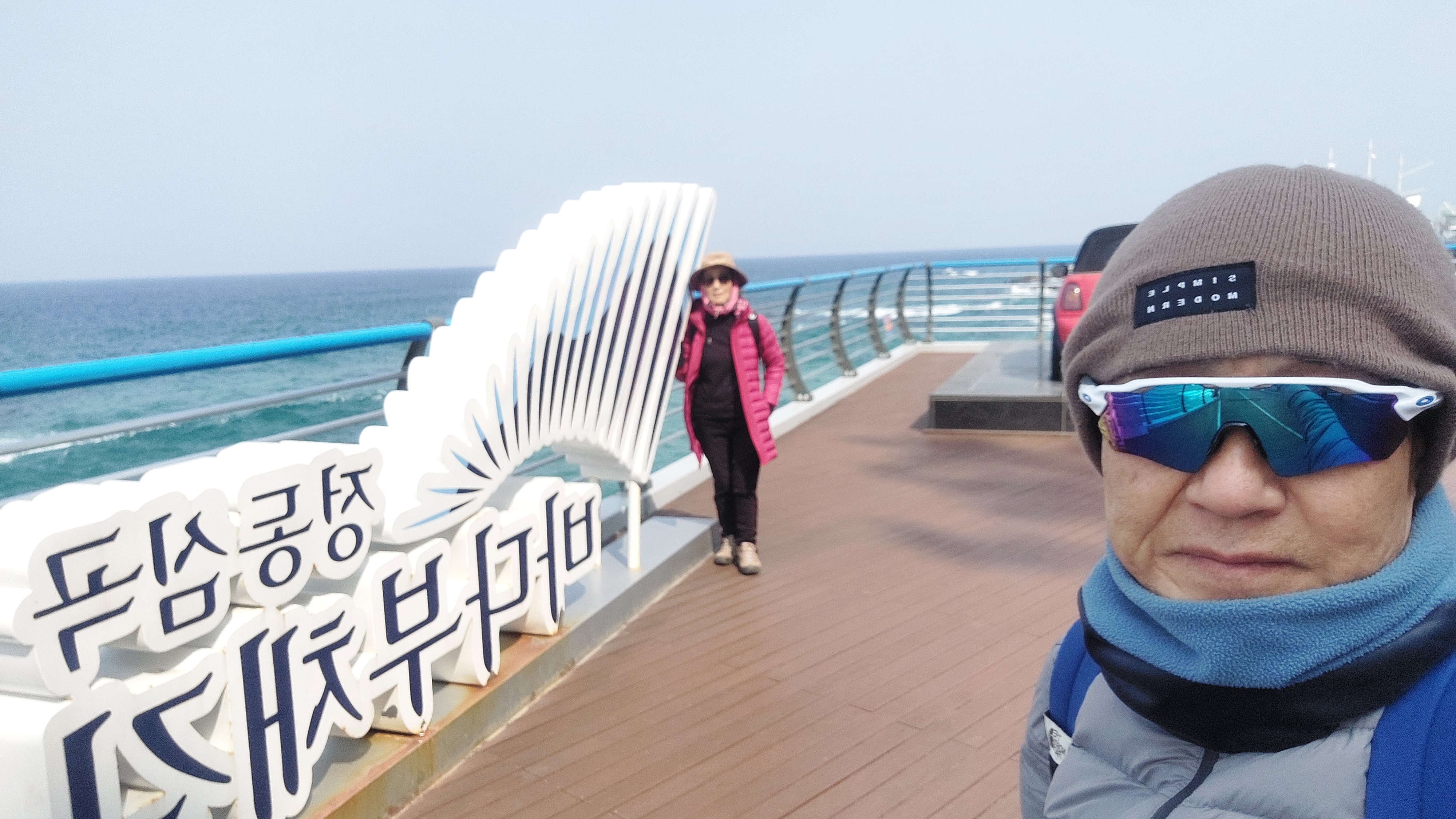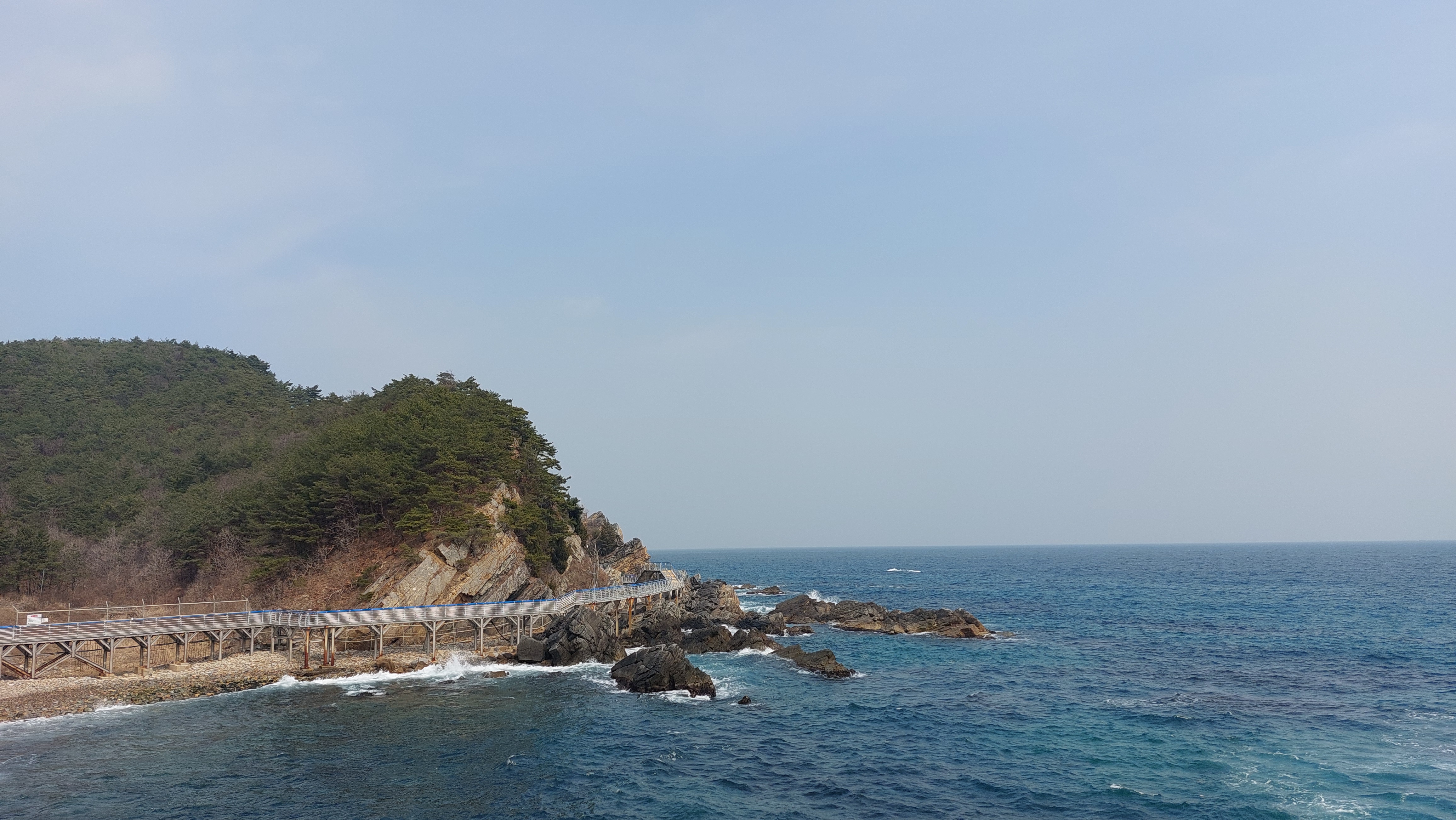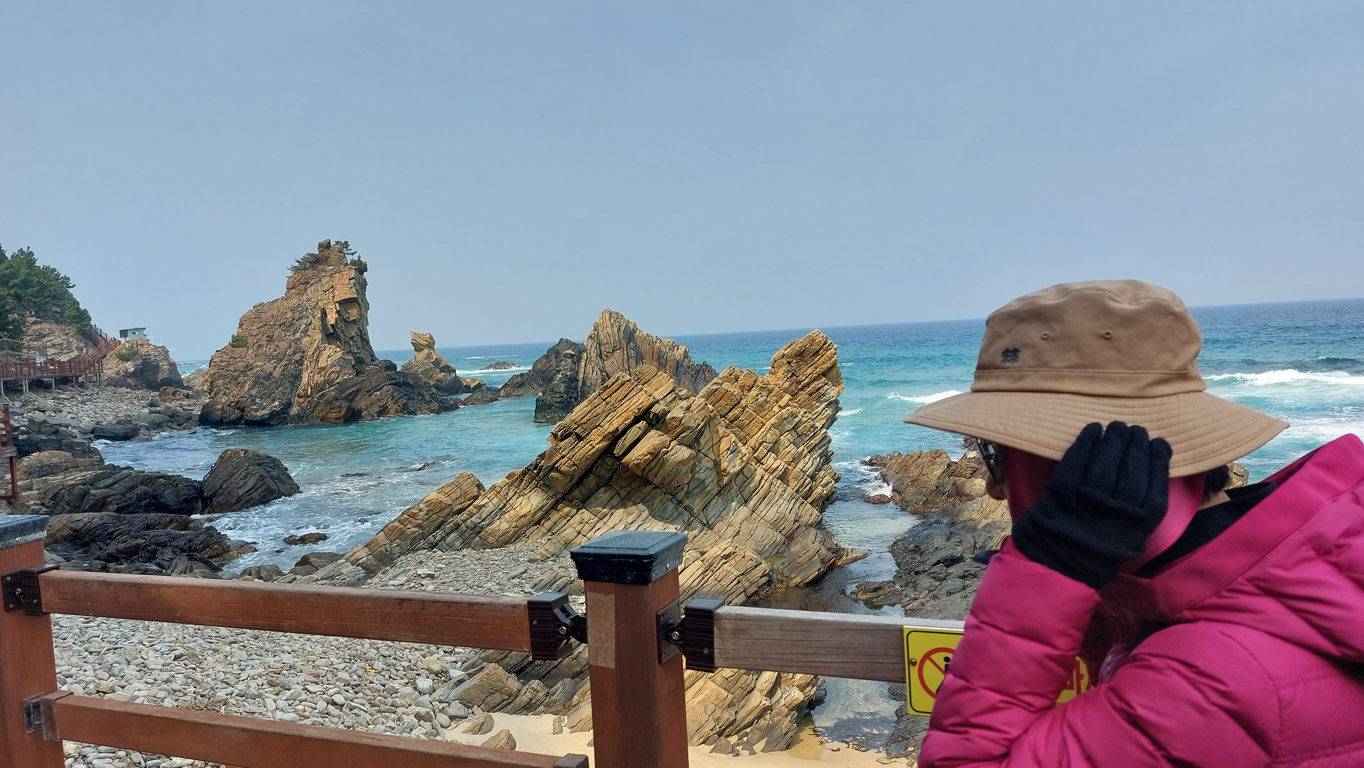 심곡항에서 바지락칼국수로 동해 맛을 본다.동해엔 바지락이 나지 않아서인지 바지락 육수 맛이 좀 떨어진다.식사 후 곧장 정동진을 향하여 단단히 얼굴을 싸매고 파도소리를 벗삼아 걷는다.적당한 곳에서 어반스케치를 하려고 했지만 데크길을 철저하게 막고 정동진까지 바닷가 진입을 불허한다.지난 여름 파도와 산사태로 길이 많이 유실되어 개보수를 했다.그래서인지 없던 입장료도 성인 5,000원(경로 3,000원)으로 입장권을 끊어야 바다부채길을 걸을 수 있다.