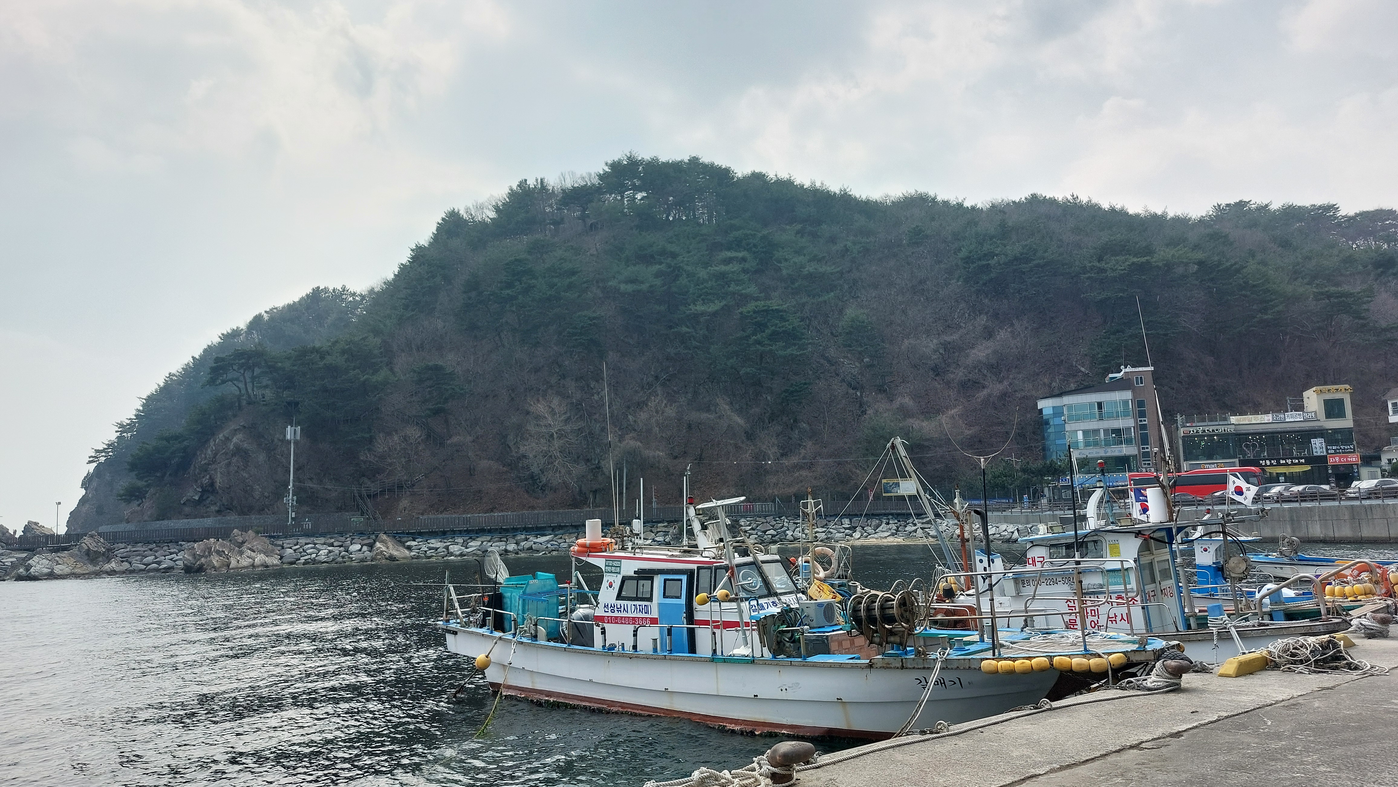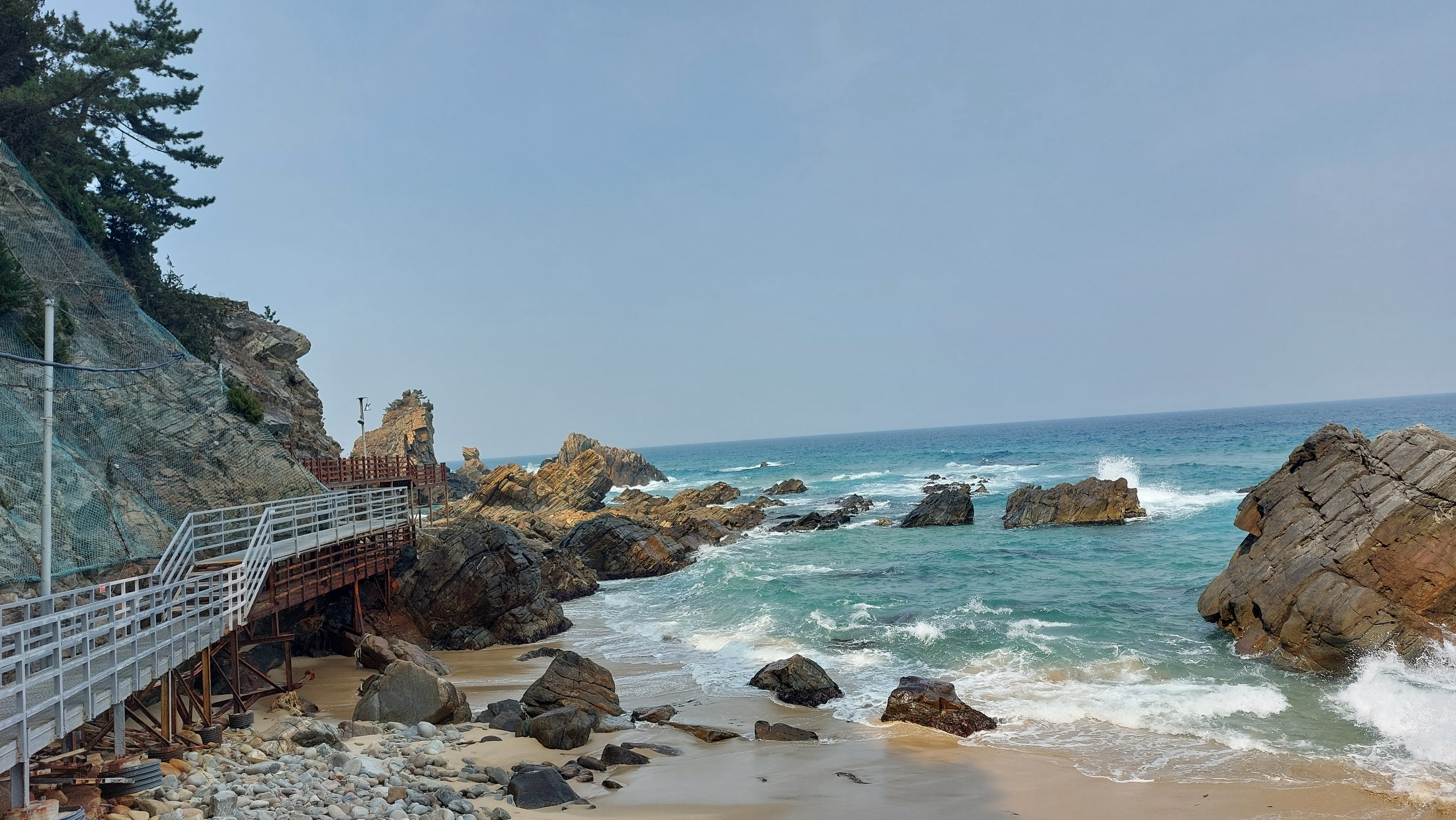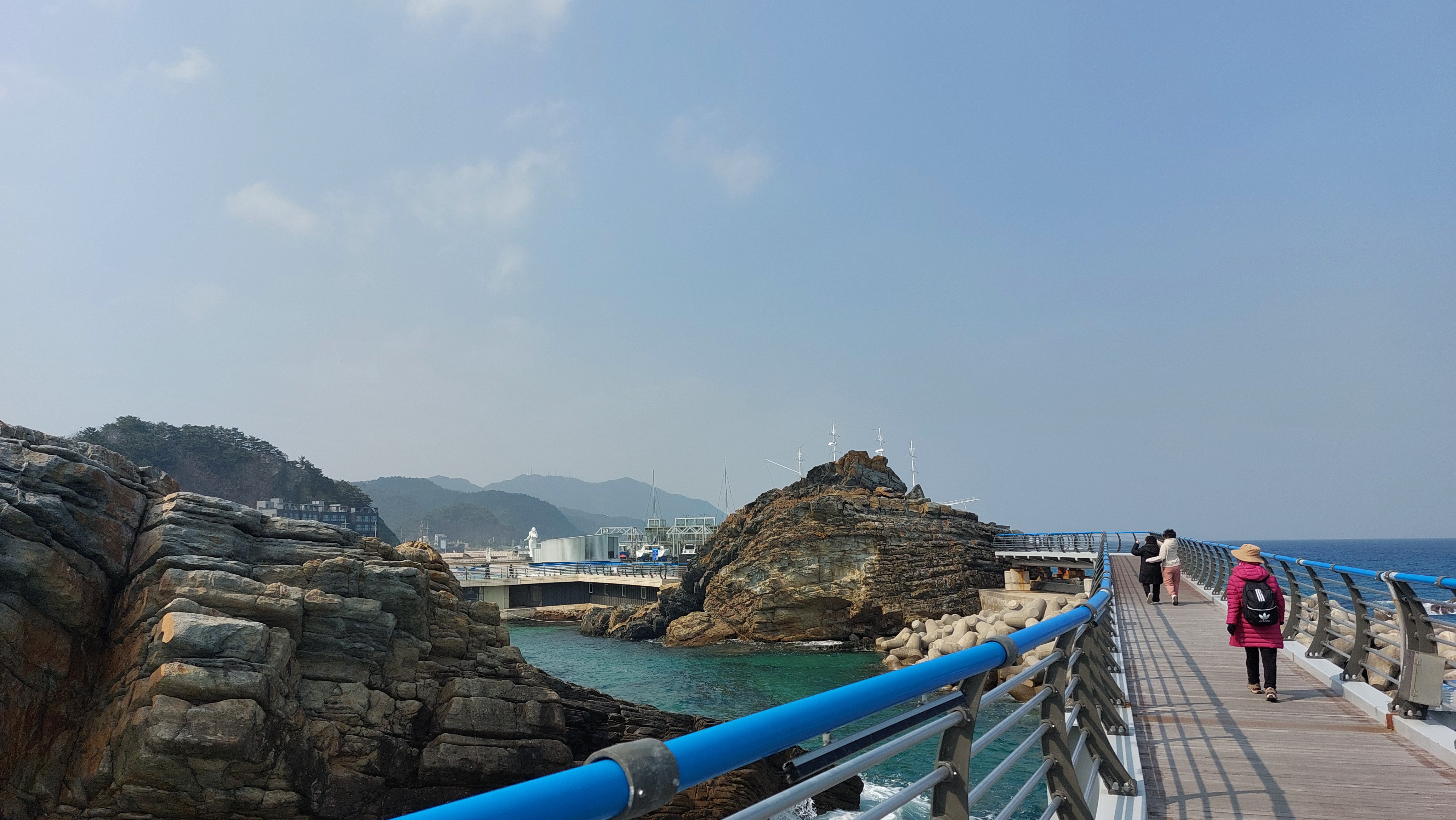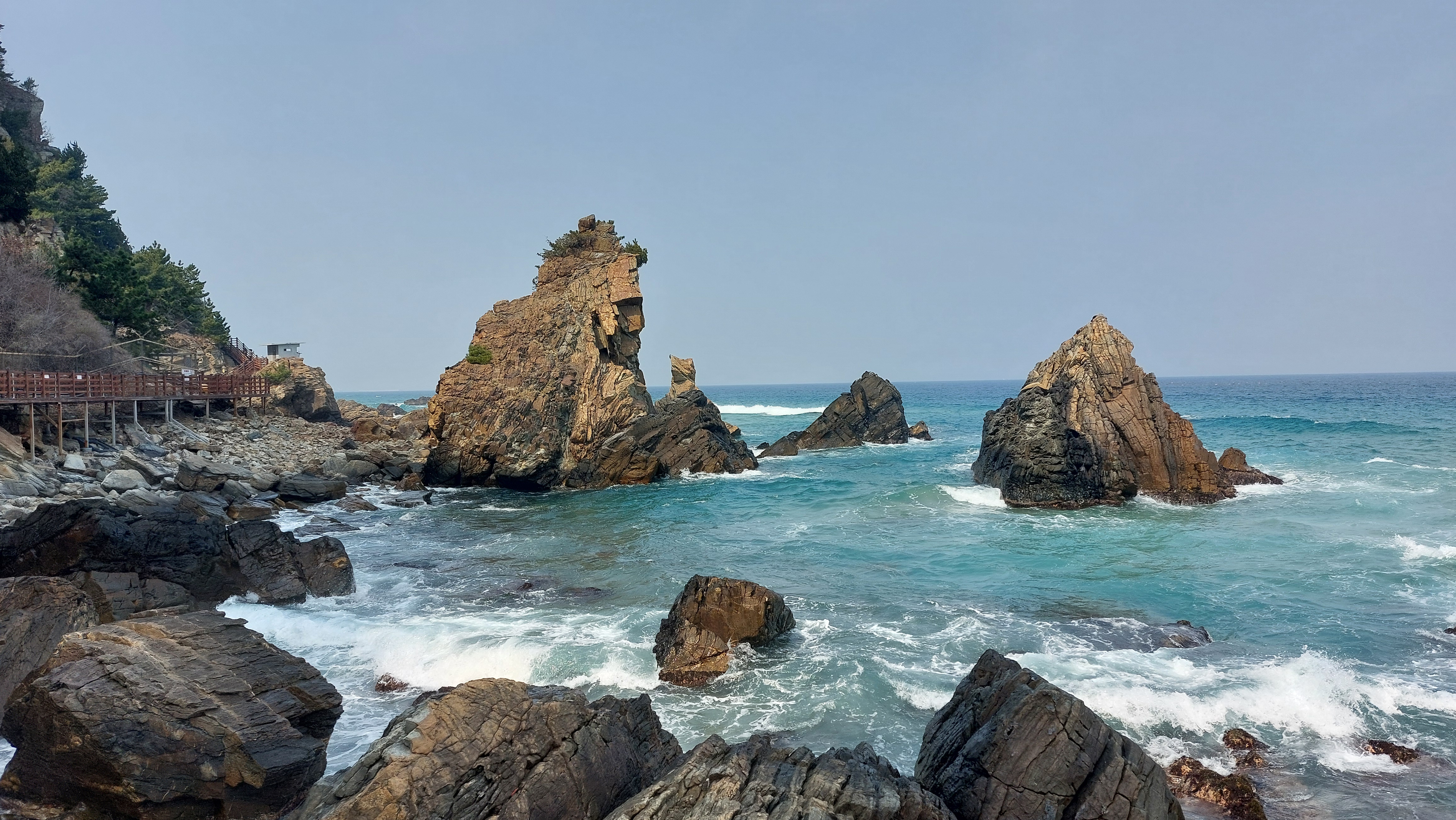 심곡항에서 바지락칼국수로 동해 맛을 본다.동해엔 바지락이 나지 않아서인지 바지락 육수 맛이 좀 떨어진다.식사 후 곧장 정동진을 향하여 단단히 얼굴을 싸매고 파도소리를 벗삼아 걷는다.적당한 곳에서 어반스케치를 하려고 했지만 데크길을 철저하게 막고 정동진까지 바닷가 진입을 불허한다.지난 여름 파도와 산사태로 길이 많이 유실되어 개보수를 했다.그래서인지 없던 입장료도 성인 5,000원(경로 3,000원)으로 입장권을 끊어야 바다부채길을 걸을 수 있다.