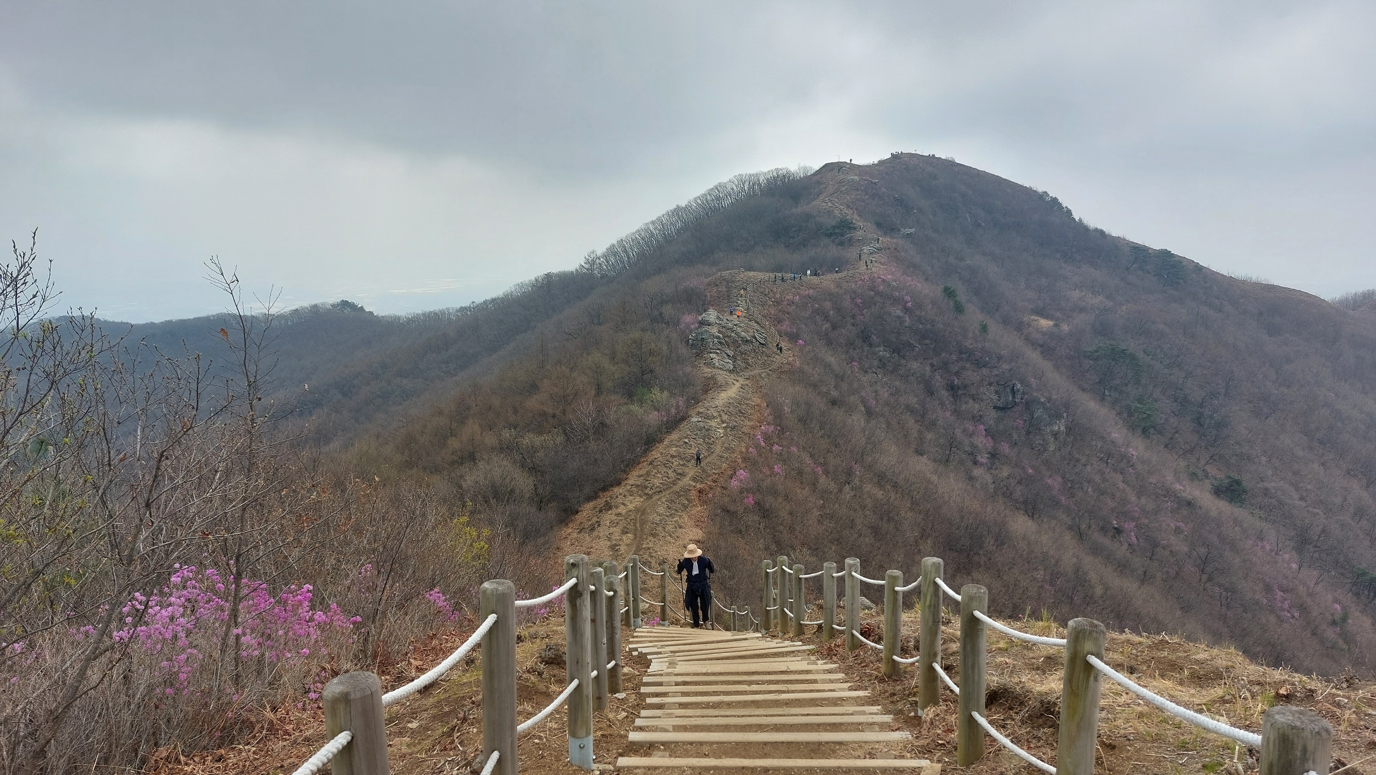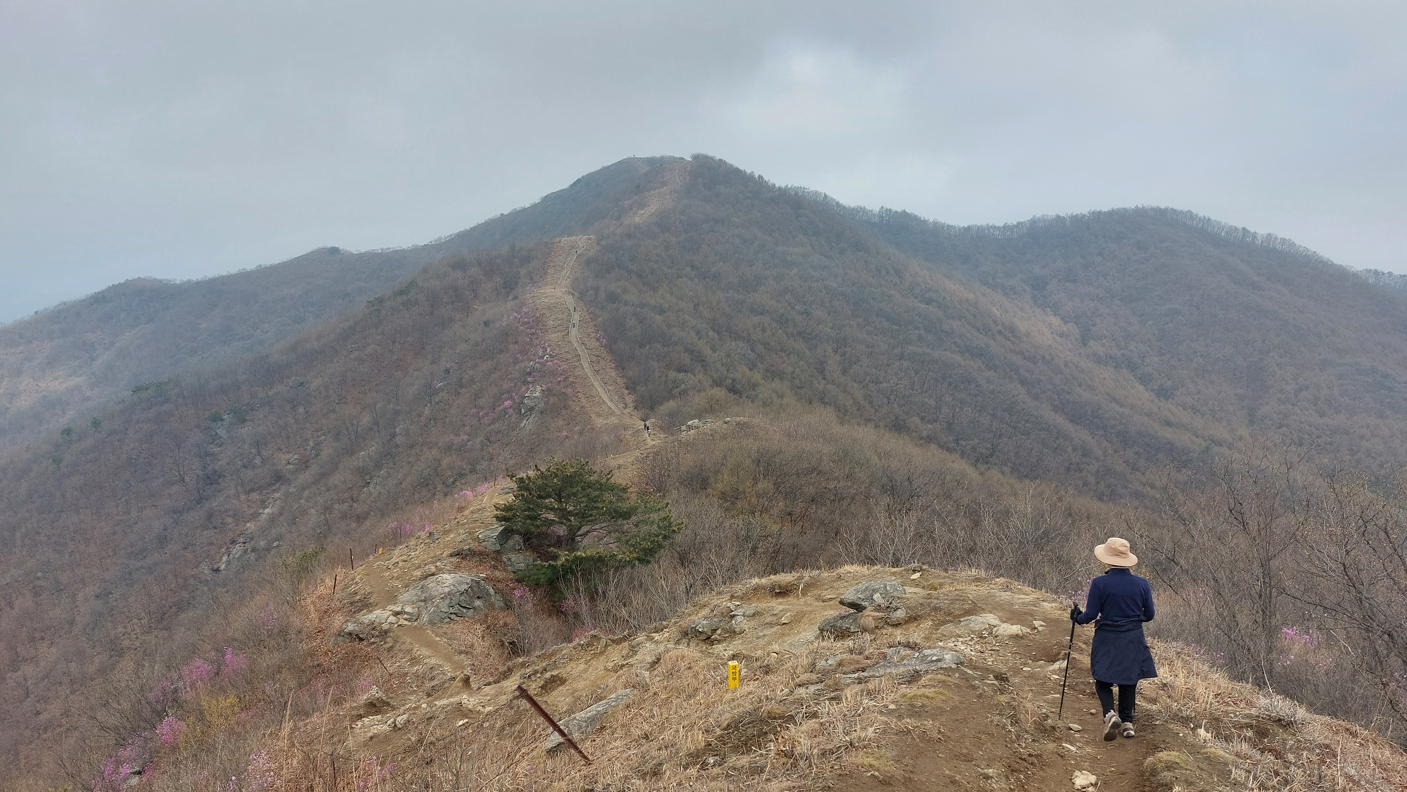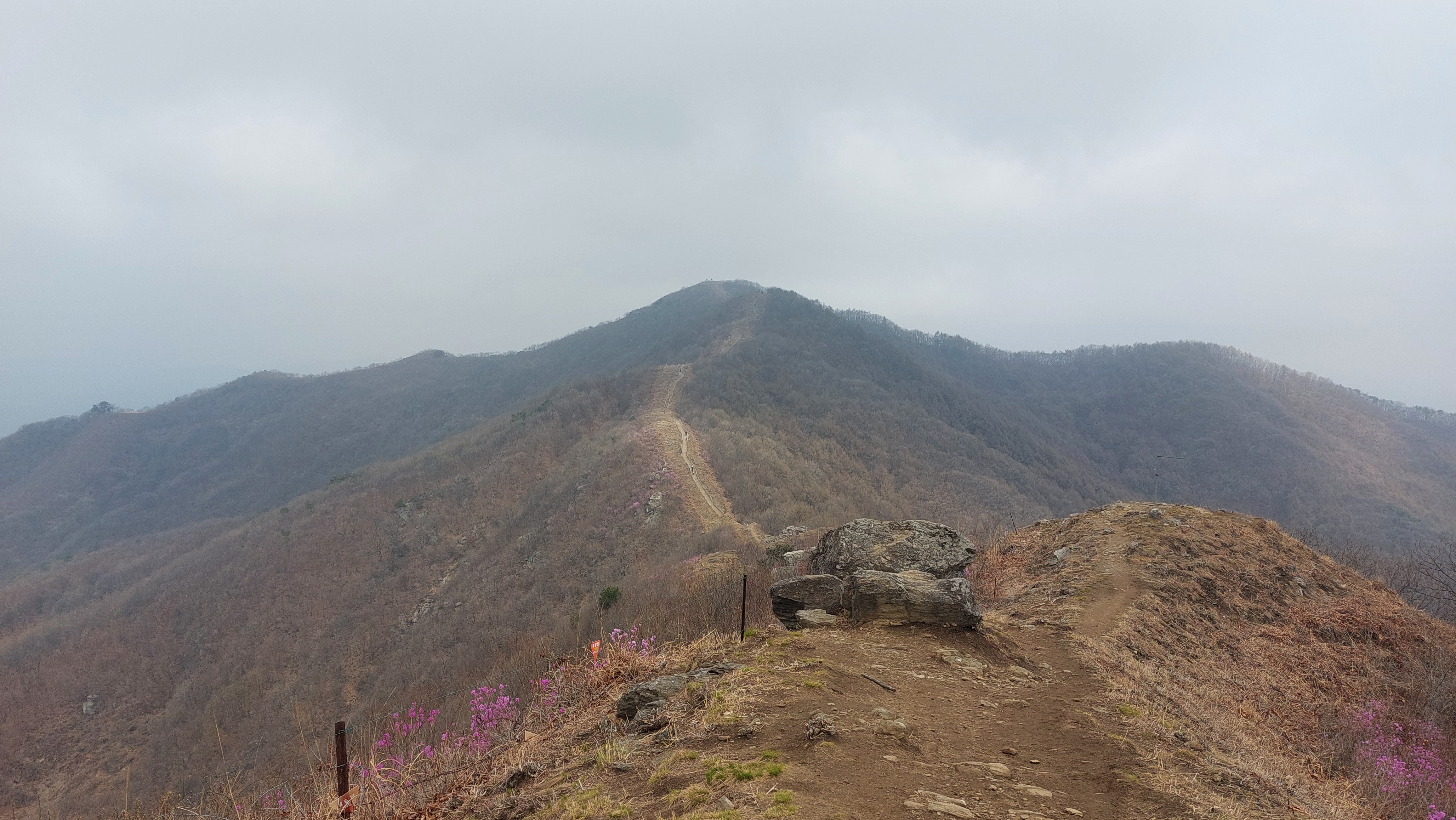 능선길에 닿자 육산길이다.진달래가 간혹 피어 울긋불긋 산을 수 놓고 생강나무는 꽃이 이미 지는 중이다.30분여 오르니 영원사에서 최단 코스로 오르는 등로와 만난다.능선길은 유순하다.간혹 오름길 된비알에는 계단이 놓여 있어 아내의 발걸음을 힘들게 한다.원적산 정상에 닿자 반대편 들머리에서 올라 온 단체 젊은 산객들로 정상은 왁자지껄 소란스럽다.