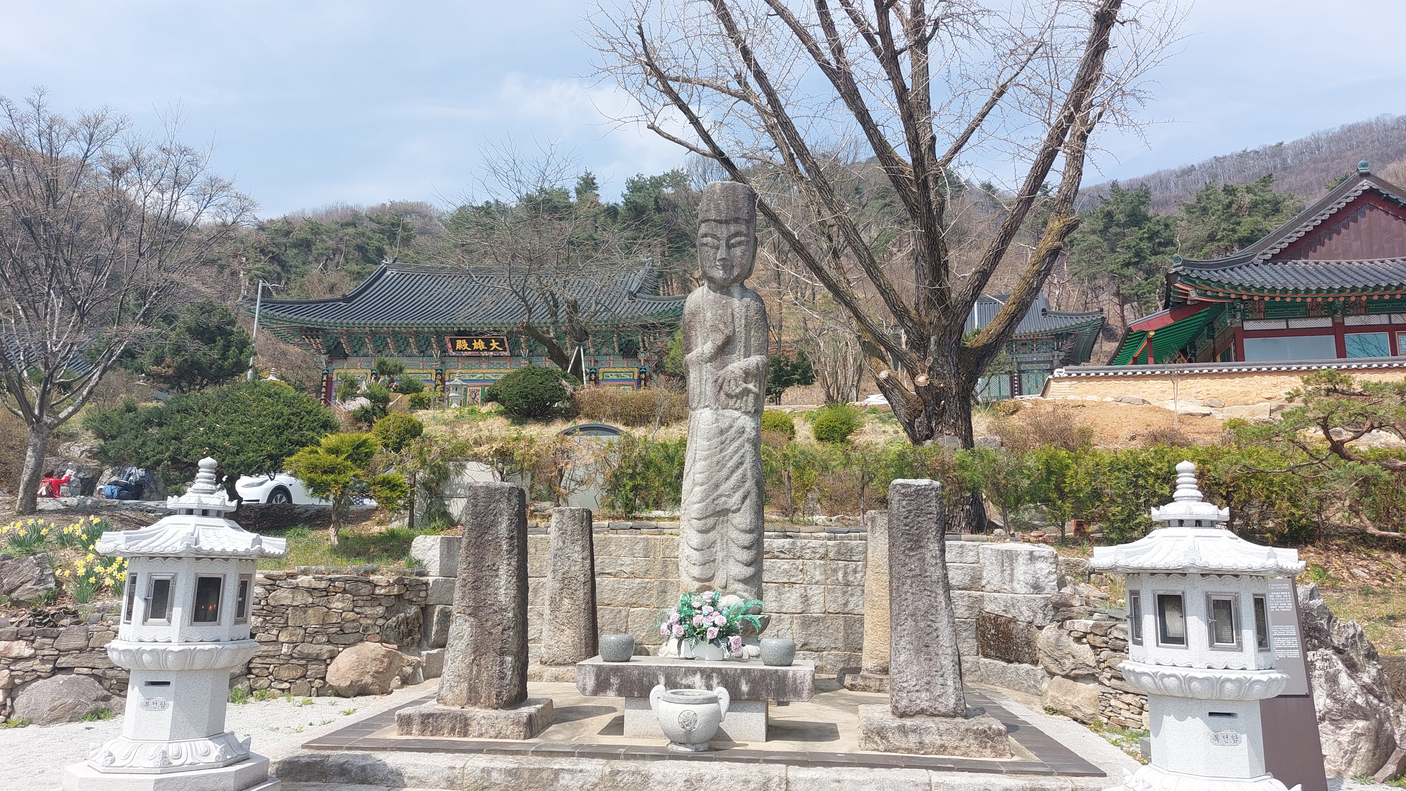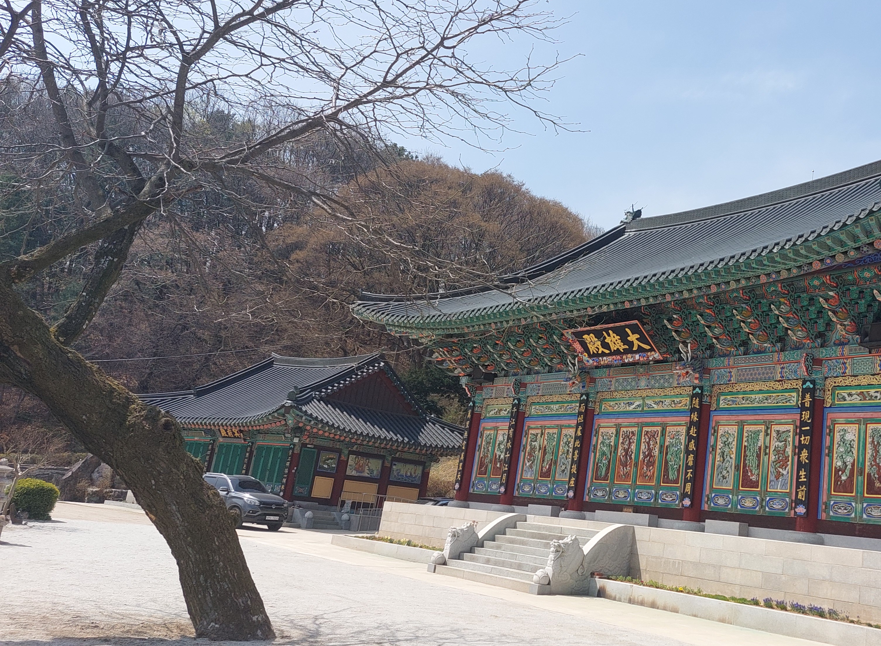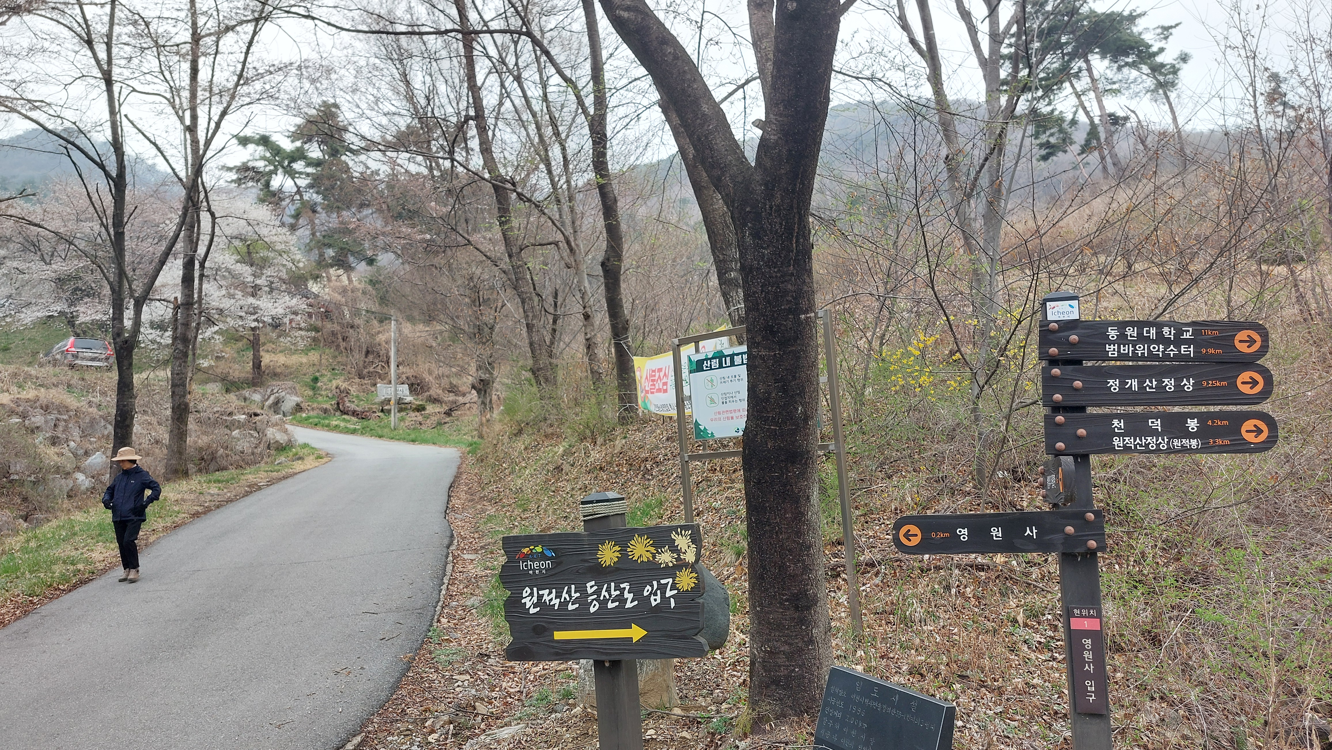 오랜만에 이천 설봉온천도 들를 겸 원적산-천덕봉 이어걷기를 계획하고 길을 떠난다.이천 가는 길도 새로 뚫려 안가본 던 길로 네비가 인도한다.개통된지 얼마되지 않아서인지 차량통행이 뜸하다. 들머리 못미쳐 산수유마을에는 산수유 꽃 축제가 오늘까지 하느라고 벌써 차량 안내를 하고 있다. 집 출발한지 50분 만에 원적산 들머리인 영원사주차장에 당도한다.절집이 꽤 크다.넉넉한 티가 난다.하산길에 들르기로 하고 바로 우측 임도길을 오른다.