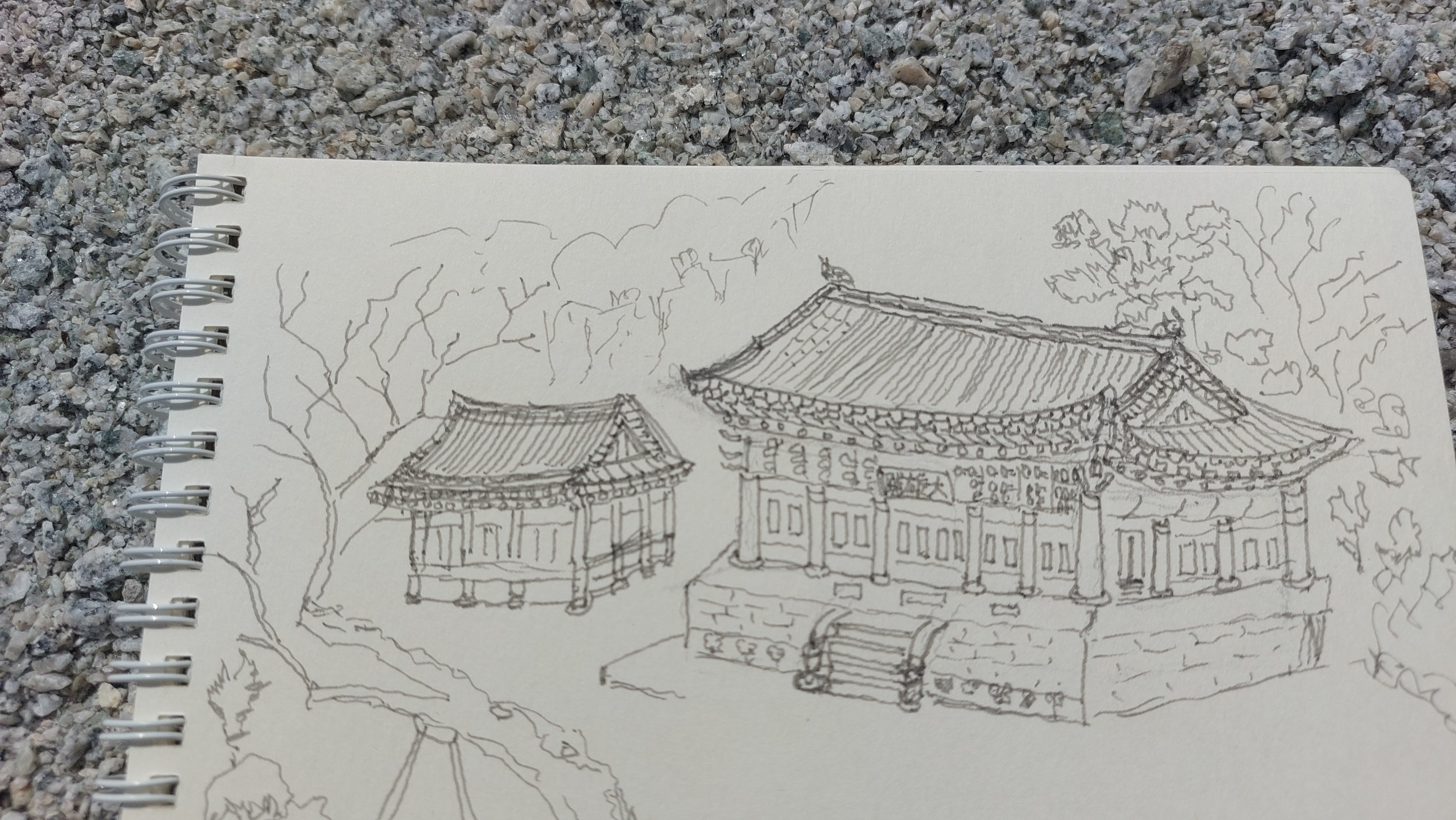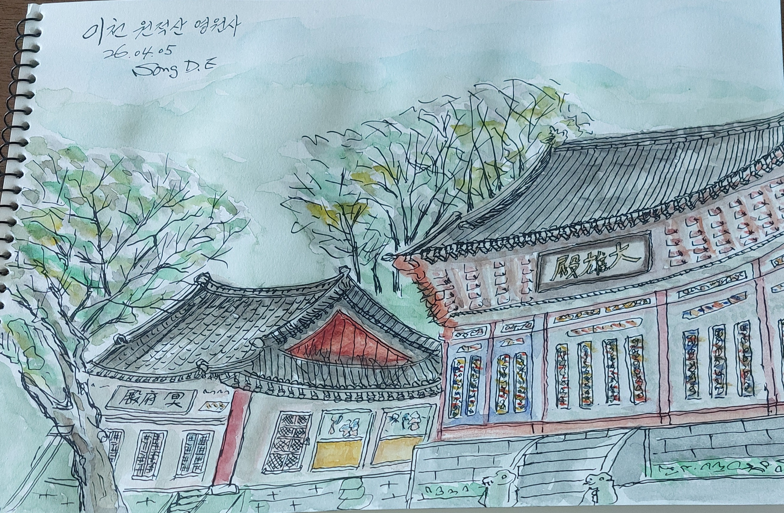 천덕봉에도 정상은 만원이다.하늘에는 인근 군부대에서 감시하는라고 드론을 띄워 놓아 웅웅댄다.이곳 역시 젊은 산객들이 떠들며 시장기를 떼우느라고 시끄럽다.우린 인증샷만 하고 원점회귀한다.날머리 영원사에 도착하여 어반스케치를 한다.절집 요사채 담벼락에 붙어 앉아 대웅전과 명부전을 그림에 담는다.요사채에서 나온 비구니 한 분이 곁에 와서 내 그림을 들여다 본다.빙그레 염화미소를 날리고 절 마당 끝으로 사라진다.대웅전과 명부전이 오늘따라 왜 그렇게 크게 보이는지.원적산을 머리에 이고 사느라고 절집은 힘이드는지 휑하다.